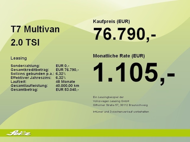 Voor zakelijke klanten bieden wij optioneel een financial lease oplossing en voor particuliere klanten een persoonlijke lening. Met onderstaande module kunt u uw maandbedrag berekenen voor het financieren van bovenstaande Volkswagen Multivan.