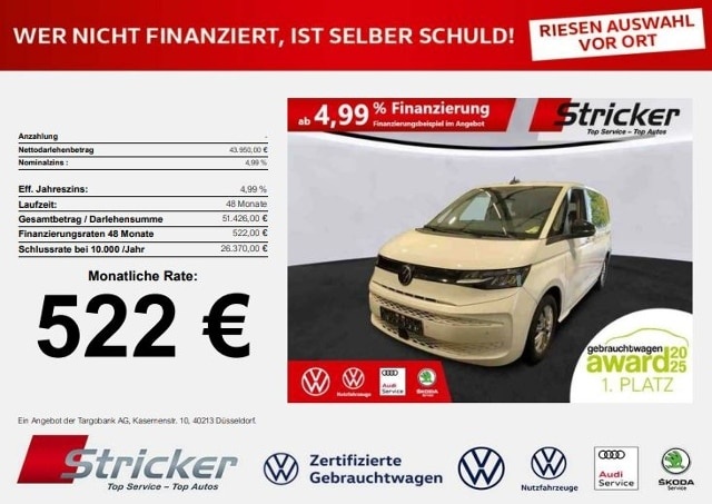 Voor zakelijke klanten bieden wij optioneel een financial lease oplossing en voor particuliere klanten een persoonlijke lening. Met onderstaande module kunt u uw maandbedrag berekenen voor het financieren van bovenstaande Volkswagen Multivan.