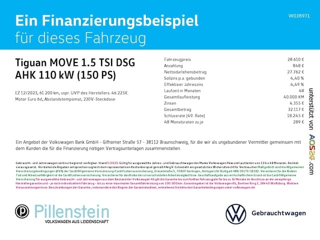 Voor zakelijke klanten bieden wij optioneel een financial lease oplossing en voor particuliere klanten een persoonlijke lening. Met onderstaande module kunt u uw maandbedrag berekenen voor het financieren van bovenstaande Volkswagen Tiguan.
